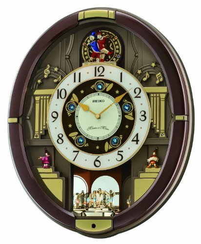 Over its 120 year history as a maker of fine timepieces, the Seiko name has become synonymous with cutting edge technology, ultra-precision, constant innovation and refinement. Millions worldwide rely on Seiko wristwatches to keep them on schedule. Two generations have grown up thrilling to Olympic and World Cup competitions where victory or defeat is defined within a fraction of a second, all overseen by Seiko timekeepers. Metallic brown case with marble painted bezel. One of 18 melodies with motion plays on the hour. 3 sets of melodies available to select in control panel. One-way rotating pendulum with 15 Swarovski crystals. Light sensor and volume control. Requires four C and one AA batteries. Dimensions: 18.25H x 15W x 4D inches.Feature