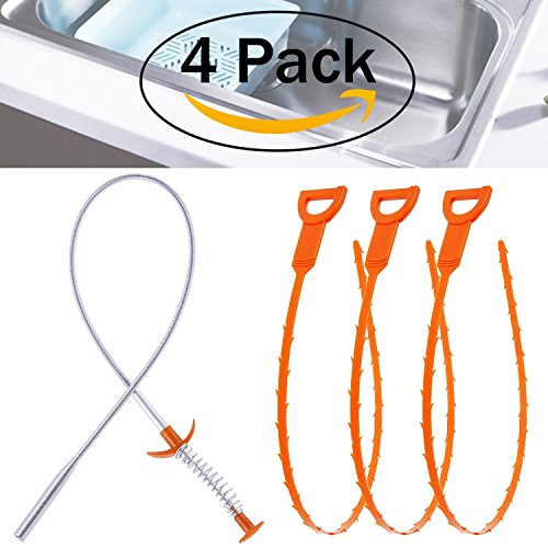 -. Feature : Quick & easy way to clear slow-moving or clogged drains. Package include 1 pack stainless steel 24 inch and 3 pack plastic drain snake 19.6 inch. / Offers two cleaning tools in 4 Pack, a tool that can capture a solid obstruction, garbage, gunk,another tool hook the hair and debris and other obstructions / Great alternative to harmful chemicals and expensive plumbing equipment,can be operate yourself instead of hire a expensive Pipe Cleaning Worker. / Durable and flexible to reach deep P-trap of drains and pipes without causing any damage,Ideal for kitchen, bathroom & utility sinks, bathtubs and showers Drains Cleaning / Easy to use, simply insert into your drain and strainers as it grabs obstructions at P-trap or hook the hair, pull out and wipe off, and repeat if necessary or throw away as one time use