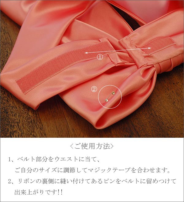 ■ご使用方法■ 1、ベルト部分をウエストに当て、ご自分のサイズに調節してマジックテープを合わせます。 2、リボンの裏側に縫い付けてあるピンをベルトに留めつけて出来上がりです!!