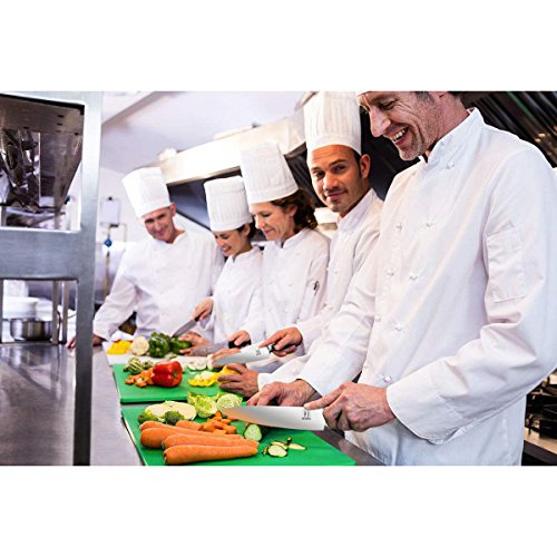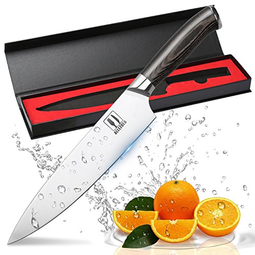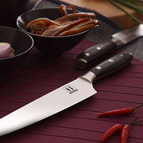 【HIGH-CARBON STAINLESS STEEL BLADE】The Professional 7.5'' chef's knife by Allezola is made of German Quality 4116 High Carbon Stainless Steel. The Professionals chef's choice. To boost its sturdiness, the steel contains 0.6-0.75 carbon, which makes it two times harder than other knives in its class as they contain about 0.3% carbon.