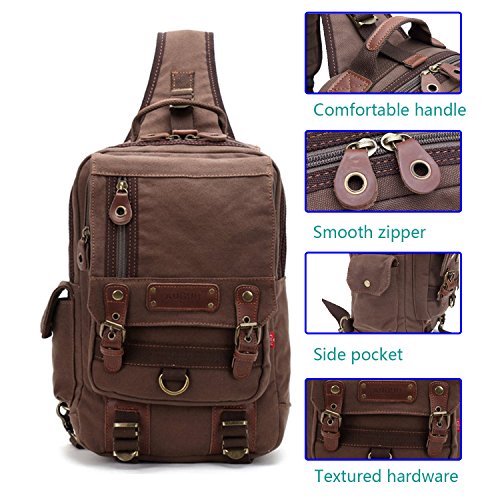 Cool Looking Features: Outer Fabric: 16 Oz soft canvas with crazy horse leather trim Inner Lining: Eco-friendly cotton Gender: Men, Womens, Students, Teen Boys and Girls Product Dimensions: 30 ×39 ×11 CM/11.8 ×15.4 ×4.3 inches (L× H× W), 10-12 L Heavy Weight: 1.8 LBS Adjustable Shoulder Straps: Left-right flexible adjustment Color: Khaki, Green, Coffee Application: Perject for outing, traveling, bicycling, shopping, college school, office, weekend and everyday use Different carry-on method: Can be used as chest bag, messenger bag, sling bag or shoulder packs