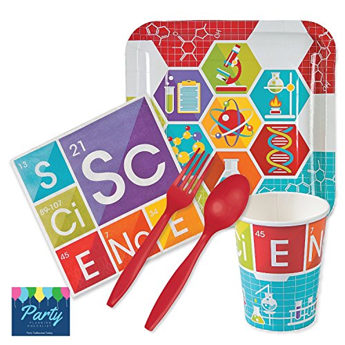 Science Party Supplies - Tableware for 16 Guests - includes Dinner Plates, Napkins, 16oz Cups, Cutlery