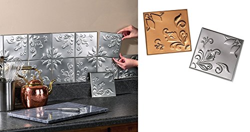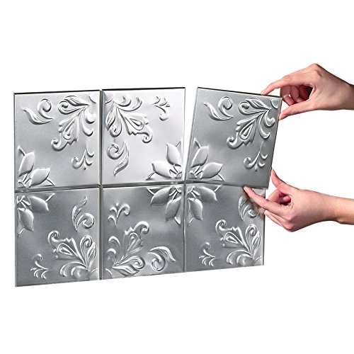 Tin Peel & Stick Raised Floral Pattern Backsplash, Kitchen, DIY Wall Tiles - Set Of 14, Silver