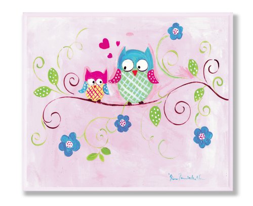 The Kids Room by Stupell Owls on Swirly Tree Branch with Flowers and Pink Background Rectangle Wall Plaque