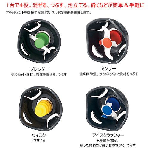 * 본체크기(H×W×D)mm:380×65×52mm(본체+샤프트)* 코드 길이:1.7m* 본체 중량:580g* 소비전력:200W* 부속품:어태치먼트(4종)고, 뚜껑 부착 쿠킹 컵,크래쉬 필터* 스피드 조절:유* 교환용 커터수:4* 교환용 커터 종류:블랜더(녹색)고, 분쇄기(빨강)고, 《우스쿠》(황)고, 아이스크러셔(청)* 회전수??? 저속:약11000회/분고속:약14000회/분