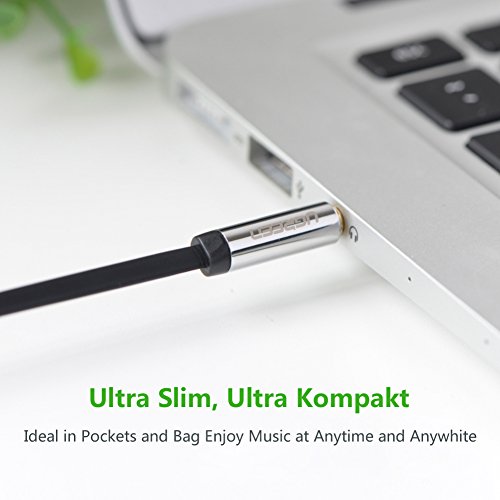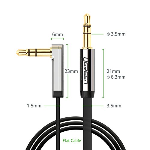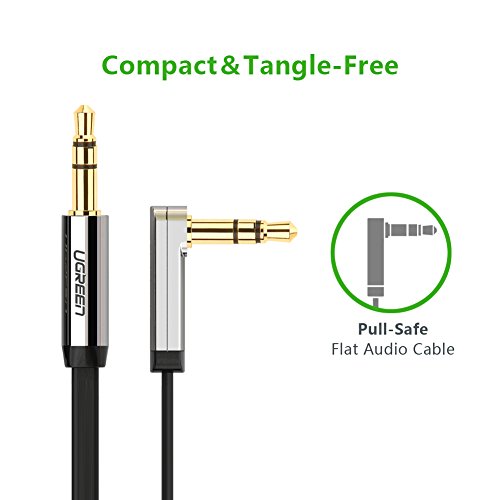 Description Ugreen Premium 3.5MM Male to Male Audio Cable is for connecting iPods, iPhones or Media Players to car stereos or speakers. It features for its right angle and ultra slim flat cable, with easy connection and storage. The slim metal case connector allows you to plug it to your source device without taking off your mobile/Tab case.