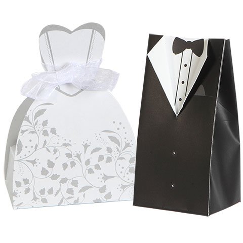 His and Hers! This set of wedding dress and tuxedo party favor boxes are just the thing for setting out guest favors at your wedding, shower, or rehearsal dinner. Perfect for your wedding favors gifts, very easy to assemble and very practical to fill.
