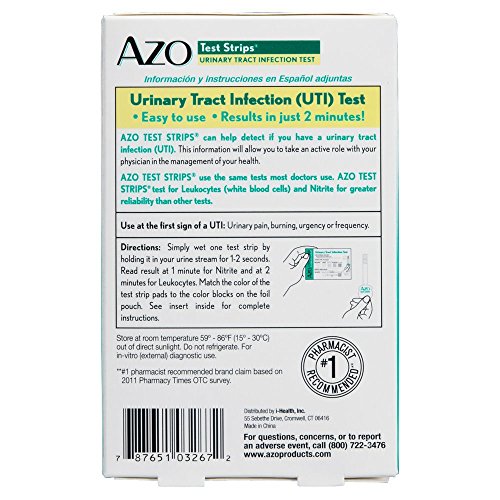 -. Binding : Health and Beauty -. Brand : I-HEALTH INC. -. EAN : 0078765103267 -. Feature : Easy to use / (Accurate) Results in 2 minutes; Results in Just 2 Minutes / Clinically tested / Clean Grip Handle / Same tests most doctors use; Uses the same tests most doctors use -. IsAdultProduct : 0 -. Label : I-HEALTH, INC. -. Manufacturer : I-HEALTH, INC. -. MPN : 10139459 -. PartNumber : 10139459 -. ProductGroup : Health and Beauty -. ProductTypeName : HEALTH_PERSONAL_CARE -. Publisher : I-HEALTH, INC. -. Studio : I-HEALTH, INC. -. Title : AZO Test Strips 3 Each -. UPC : 078765103267