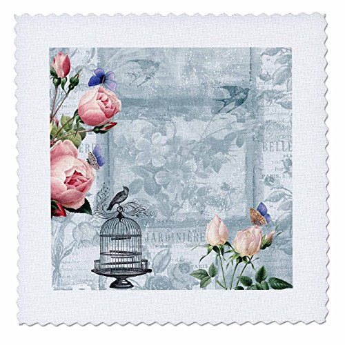 3dRose qs_123582_5 Roses and Bird Cage Vintage Floral Quilt Square, 14 by 14-Inch