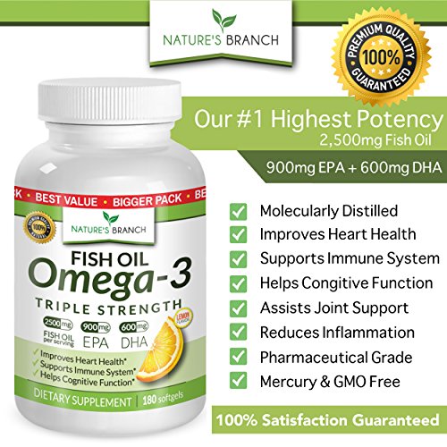 -. Title : BEST TRIPLE STRENGTH Omega 3 Fish Oil Pills ★ 180 Capsules ★ 2500mg HIGH POTENCY Lemon Flavor 860mg EPA 650mg DHA Pure Burpless Liquid Softgels Best Brain Joints Eyes Heart Health Supplement