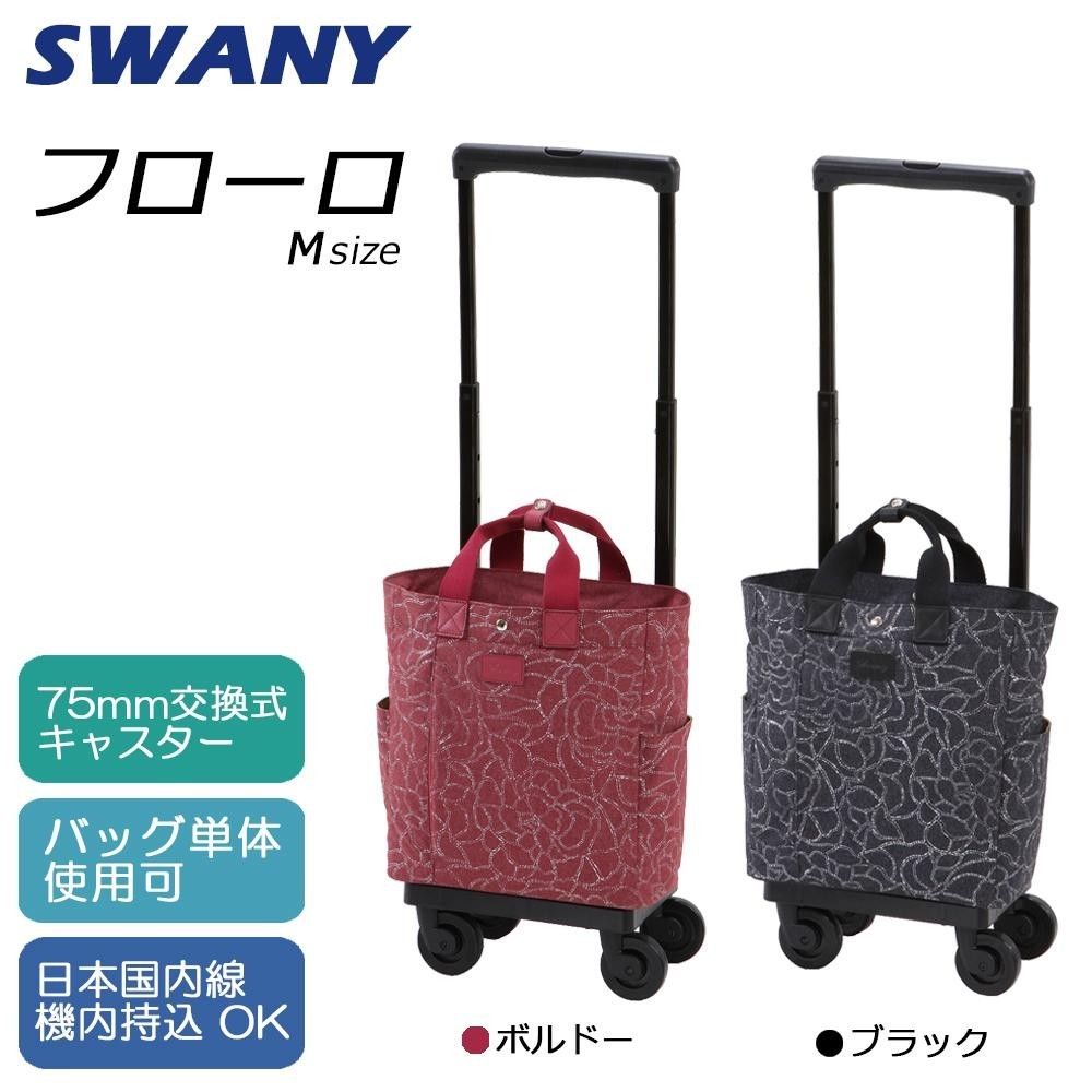 | 75mmキャスター、容量アップ、バッグとフレームは簡単着脱、2kgを切る軽量など欲しい機能が沢山搭載されたモデルです。表生地はデニム調生地にシルバーのフラワープリントを施しています。国内線機内持ち込み可能サイズです。電車・バスなどお乗りの際の自走防止用ストラップが付属しています。 |
