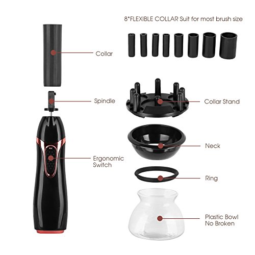 - 【PACKAGE INCLUDES】: 8 rubber holders, a brush spinner, a plastic bowl, splash guard ring and a brush holder stand. The brush cleaner needs 2 AAA battery Operated (batteries not included).