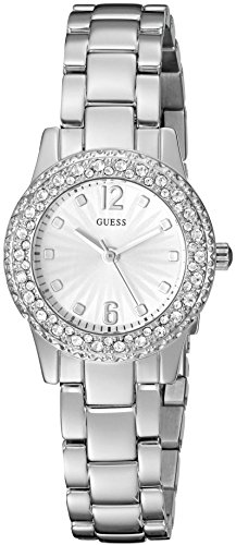 -. Binding : Watch -. Brand : GUESS -. Color : Silver -. Department : womens -. EAN : 0091661465482 -. Feature : Round silver-tone watch featuring wide rhinestone-encrusted bezel and starburst patterning on dial / 29.5 mm stainless steel case with mineral dial window / Quartz movement with analog display / Stainless steel bracelet with deployant buckle closure / Water resistant to 30m (100ft): in general, withstands splashes or brief immersion in water, but not suitable for swimming or bathing -. Label : Sequel International -. Manufacturer : Sequel International -. Model : U0889L1 -. MPN : U0889L1 -. NumberOfItems : 1 -. PartNumber : U0889L1 -. ProductGroup : Watch -. ProductTypeName : WATCH -. Publisher : Sequel International -. Size : NS -. Studio : Sequel International -. Title : GUESS Women's U0889L1 Petite Silver-Tone Watch with Silver Dial , Crystal-Accented Bezel and Stainless Steel Pilot Buckle -. UPC : 091661465482