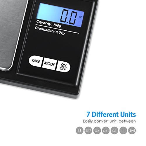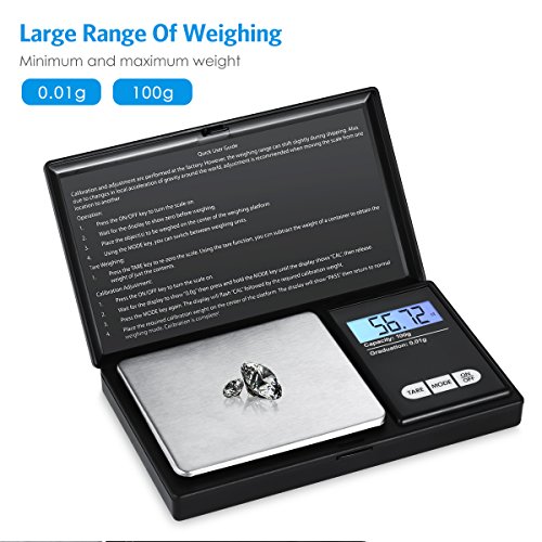 AMIR Digital Mini Scale is famous with its compact and lightweight design, perfect for you to take it everywhere. Its high accuracy makes it a pro pocket scale to measure all kind of items or objects. The high quality LCD screen is backed by a bright blue LED backlight allowing it to be used and read easily in low light conditions. The compact design of these scales with their small size, auto-off feature. They also include an additional two non-connected slots in the battery compartment, allowing you to carry spare batteries with you at all times. Features: Units of Measure: g / gn / oz / ozt / ct / tl / dwt Easy to reading: LCD display with blue back-lit for easy viewing (light can be turned off). Readability: 0.01g / 0.1gn / 0.001oz / 0.001ozt / 0.01ct / 0.001tl / 0.01dwt Specifications: 1. Capacity: 100g / 0.01g 2. Automatic shut off Time: approximately 30s 3. Battery: 2 X AAA (Included) 4. Calibration Function: Yes (Not Included) 5. Dimensions: 125mm x 75mm x 20mm 6. Package material: stainless steels Note: ● When using the scale, gently take off the protective flip cover first, put in an environment of windless and no vibration. ● Please do not exceed the rated weight when weighing, in case damaging the sensor. Please do not impact tray, handle with care. ● When using the scale, please ensure that no electromagnetic interference around 50cm, in case get inaccurate result. Package Included: 1 x Digital pocket scale 2 x AAA batteries Seller Warranty Policy: - 45-Day Money Back Guarantee - 12-Month Replacement Warranty - 7/24 Online Customer Service - Lifetime Support Guarantee GCID: AMIR 0 |