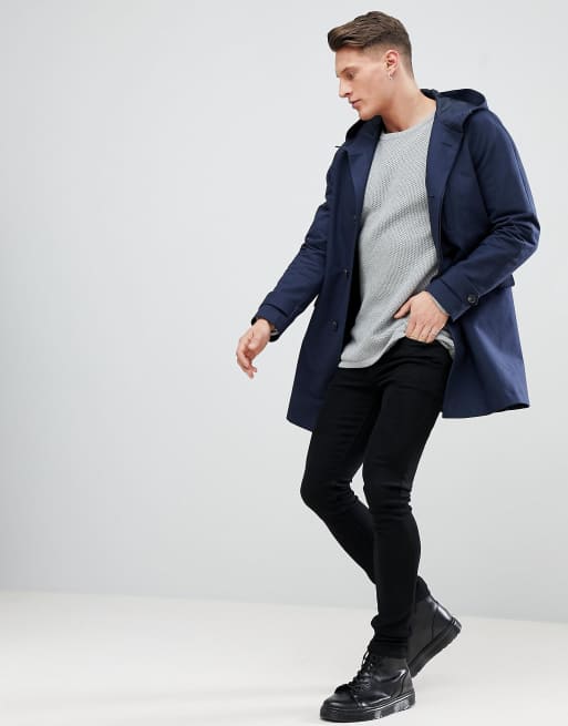 ASOS Hooded Trench Coat With Shower Resistance in Navy