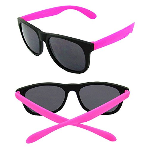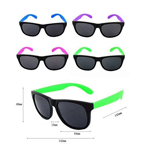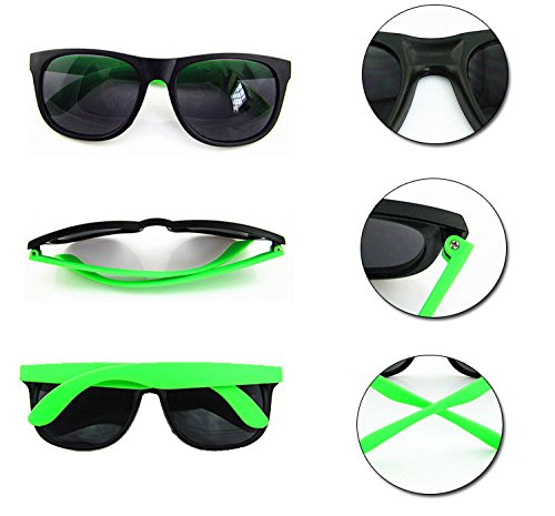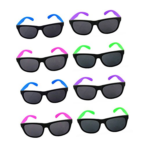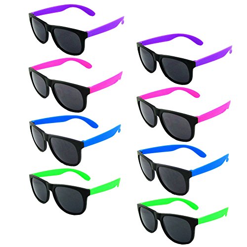 DESIGN: Comfortable unisex design wayfarer square glasses. This Collection of 8 Novelty Sunglasses Features a Variety of Bright Neon Colors on the Hinges and Frames.