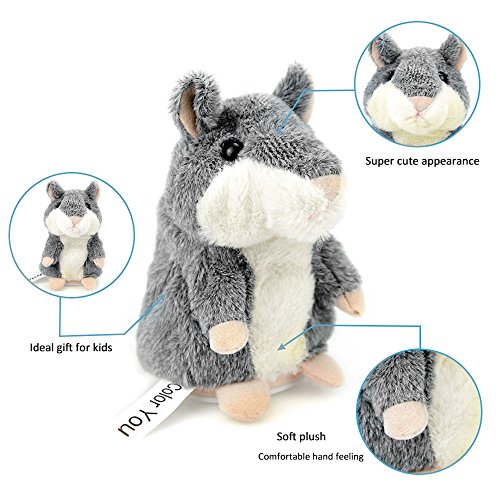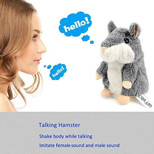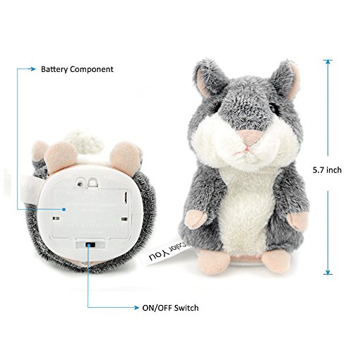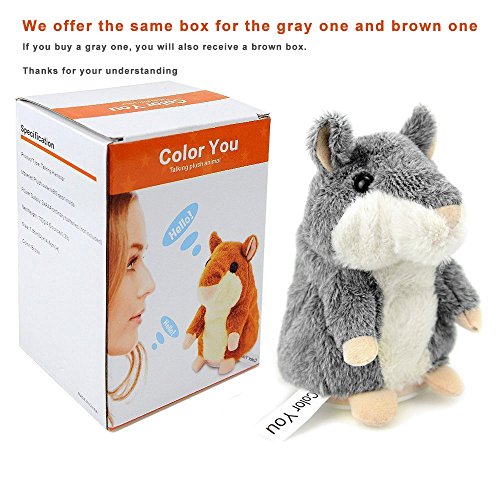 Specifications: ♦Repeat everything you say. If you giggle, he giggles; if you sing, he sing back to you! ♦Material: plush and ABS(no pilling or wrap) ♦The length of talking can record: Within 5S ♦receving sound dB:≥100dB ♦Net weight: 130g/4.6 ounce/0.3lb ♦Measurements: Diameter:7.8cm; Height: 14.5cm ♦Fit for chidren: over 4 years old Warning: Please rub and tap the Talking Hamster if the head of it doesn't move when you talk to it at first time. The talking hamster bops his head up and down when repeating you words will make the inside machine rubbing and cause a little noise. Warm Tips: The Talking Hamster works with high power consumption, please use new batteries once the batteries run out. Batteries are NOT included. A screwdriver is required to open the battery compartment lid to replace batteries. Screwdriver NOT included. How to use it: ♦Flip the switch to ON position and talk to it, It will repeat everything you say. ♦Flip the switch to OFF position when not use it. ♦The switch is on the bottom. Package includes: ♦1 x Color You Talking Hamster ♦1 x using manual If there is anything puzzles you about the page, please feel free to contact Color You after sale customer service. It is a pleasure to provide the best service for you!Feature