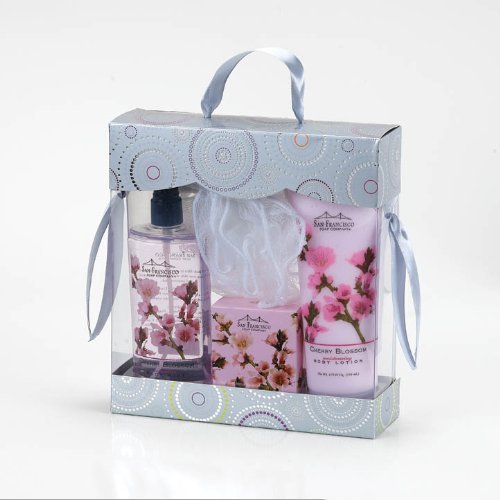 San Francisco Soap Co. Body Lotion, Body Mist, Bar Soap & Pouf - Bath and Body Gift Boxed 4 Piece Set (Cherry Blossom)