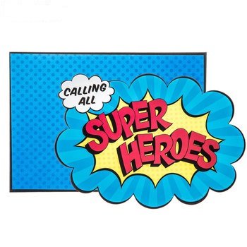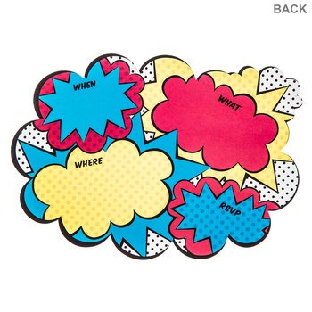 Product Description: Sign, seal, and deliver party invitations that pack a punch! Superhero Birthday Invitations feature gorgeous comic bubble charm with "Calling All Superheros" in colorful text on one side and places for party details on the other. Slip them into the polka-dotted, primary-colored envelopes for a dash of heroic charm that each recipient will love!