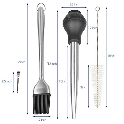 THE SET LNCLUDES: Deluxe Turkey Baster. Stainless Steel injector needle. Stainless Steel cleaning brush. Heavy-duty 12 Inch Stainless Steel Handle BBQ Basting Brush