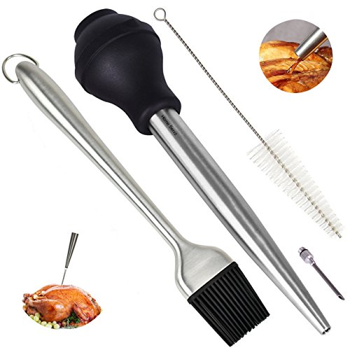 MULTI-PUYPOSE: Turkey Baster creates powerful suction.are able to effortlessly collect hot pan liquids. attach the needle included to inject and infuse flavorful juices into your roasts and cuts of meat. quality basting brush, the food grade silicone bristles are supple, and they grab the sauce and allow you to get the sauce where it needs to go, in every crack and crevice.