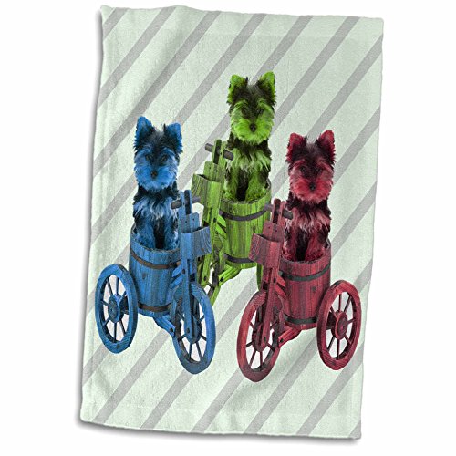 3D Rose Teacup Yorkies on Bikes. Blue-Green-Red. Pop Art. Puppy-Animal Hand Towel, 15" x 22"