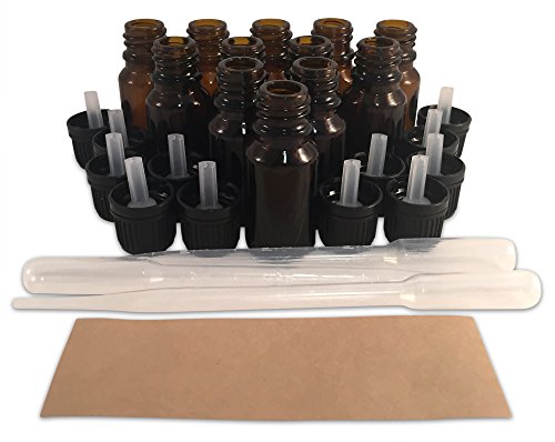 12 New, Premium Quality, 10 ML Amber Glass Euro Dropper Bottles with Tamper-Evident Caps, Round Craft Labels and (3) 3ml Plastic Pipettes - Ideal for use with Essential Oils and Aromatherapy Blends