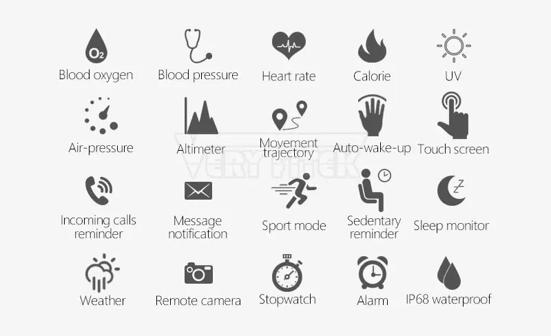 Function:Altitude Meter,Message Reminder,Chronograph,Passometer,Alarm Clock,Activity Tracker,Blood Oxygen,Fitness Tracker,Blood Pressure,Call Reminder,Remote Control,Sleep Tracker,Heart Rate Tracker,Push Message,Social Media Notifications