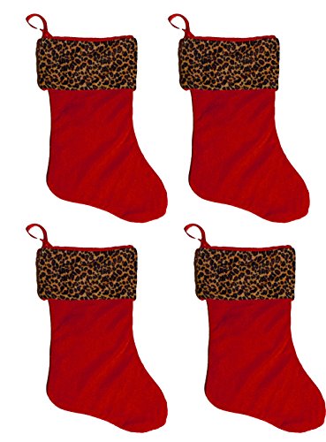 17" Deluxe Plush Red Christmas Stocking with Leopard Print Plush Cuff & Red Hanging Tag (4 Pack)