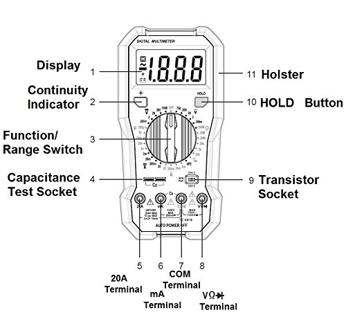 This is a 3 1/2-digit digital multimeter for measuring DC and AC voltage, DC and AC current, resistance, diode, continuity, capacitance and transistor.