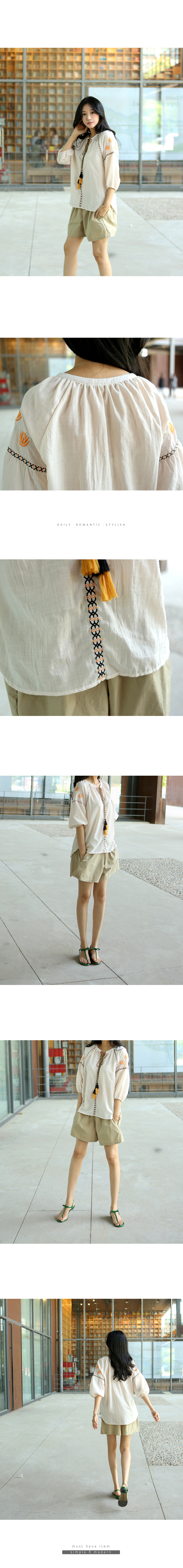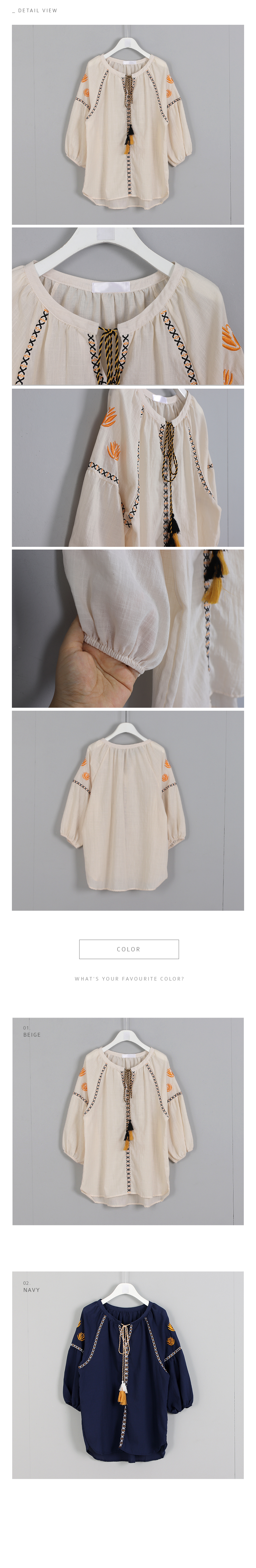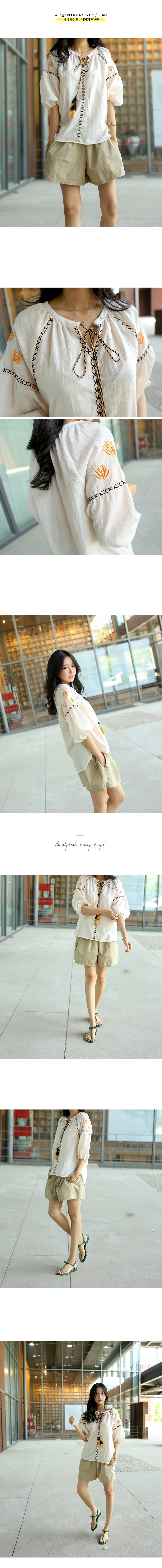 부드러운 어깨선을 돋보이게 해주는자수디테일과 라인마다 테이핑으로디자인을 살려주고 목선에서 묶어연출하는리본의 풍성한 태슬이포인트가 되어주는 코튼 블라우스에요둥근 퍼프소매는 밴딩으로 마무리해줘편하게 연출하기 좋고 넉넉한 오버핏으로편안하고 멋스럽게 입기 좋은 아이템이랍니다얇은 아사코튼 소재로 시원하고네추럴한 소재감이 디자인과 잘 어울려요색상은 베이지, 네이비사이즈는 FREE 44~66반▼ 관련상품 : 바이오코튼 와이드 반바지