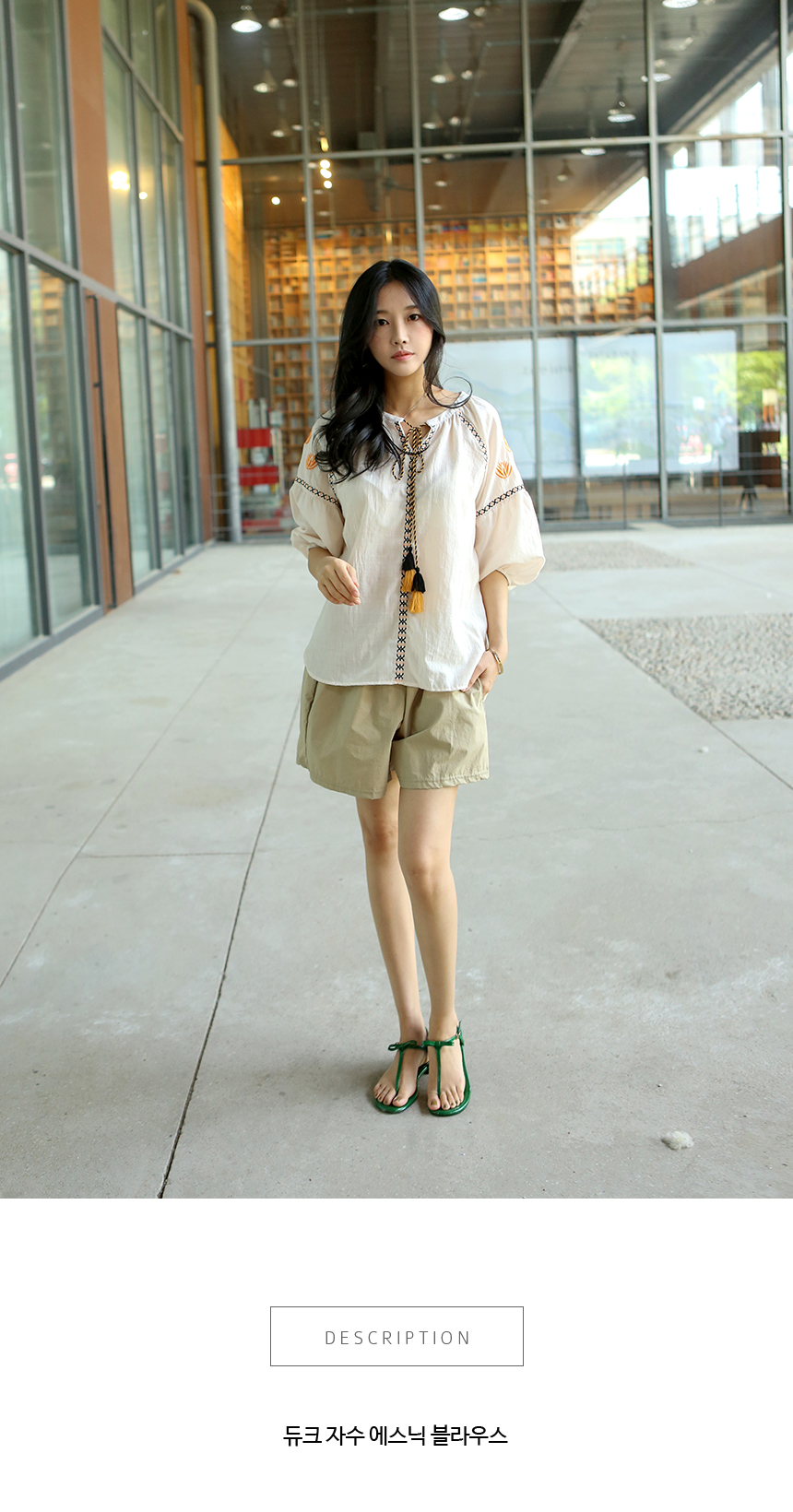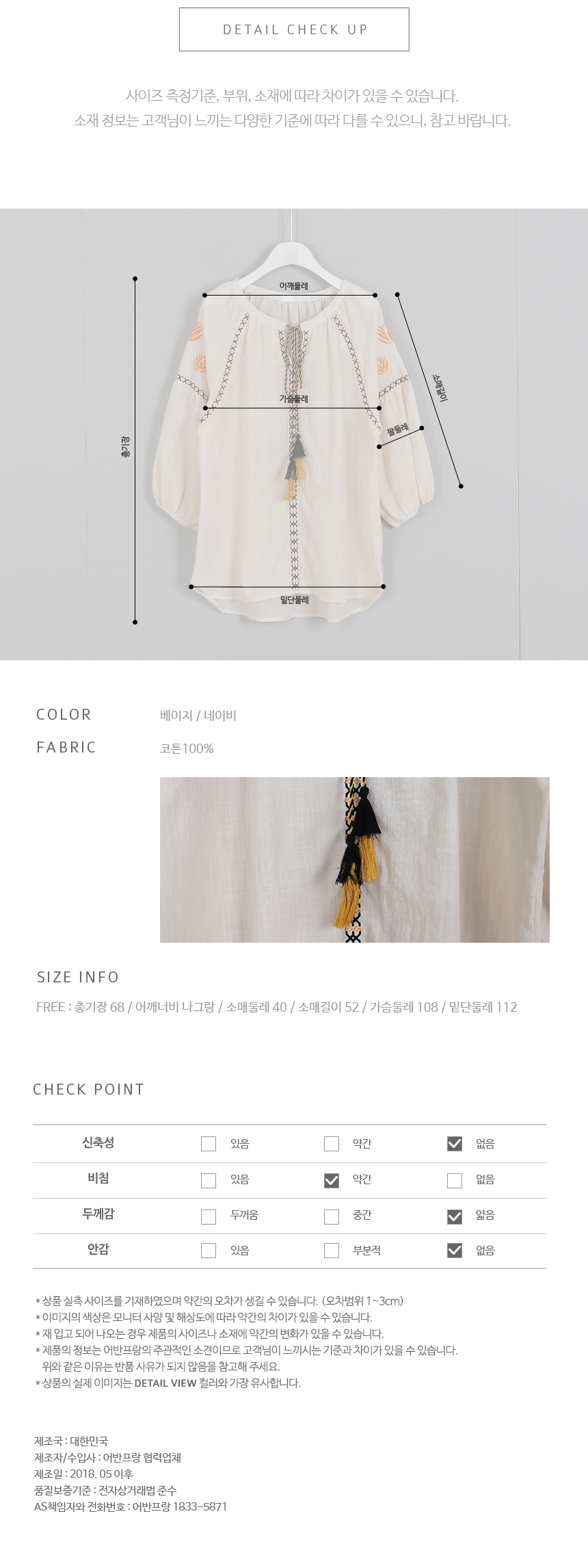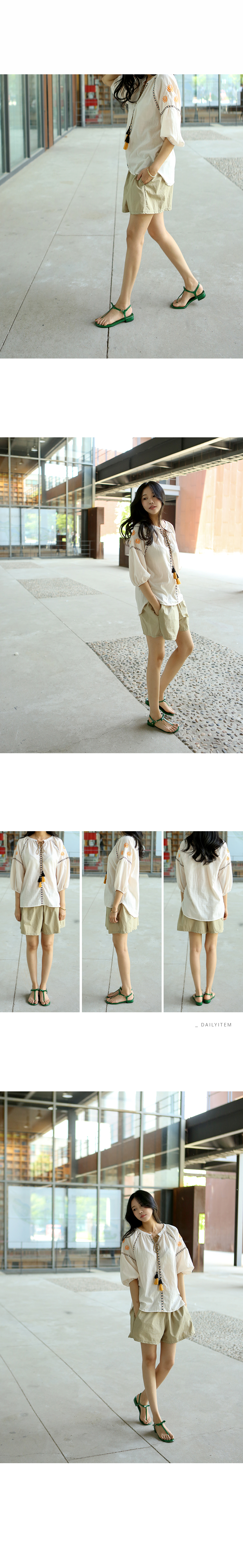 부드러운 어깨선을 돋보이게 해주는자수디테일과 라인마다 테이핑으로디자인을 살려주고 목선에서 묶어연출하는리본의 풍성한 태슬이포인트가 되어주는 코튼 블라우스에요둥근 퍼프소매는 밴딩으로 마무리해줘편하게 연출하기 좋고 넉넉한 오버핏으로편안하고 멋스럽게 입기 좋은 아이템이랍니다얇은 아사코튼 소재로 시원하고네추럴한 소재감이 디자인과 잘 어울려요색상은 베이지, 네이비사이즈는 FREE 44~66반▼ 관련상품 : 바이오코튼 와이드 반바지