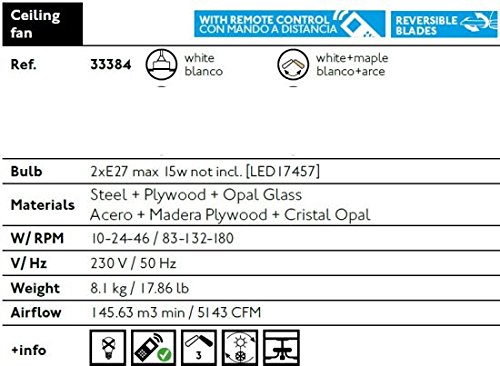 -. Feature : Deckenventilator Lorefar TONSAY Faro 33384 mit integrierter Deckenleuchte Energiesparlampen 2xE27 max. 15 Watt nicht im Lieferumfang inbegriffen / 3 Geschwindigkeitsstufen 83-132-180 Umdrehungen pro Minute bei einer Leistung ond 10-24-46 Watt je nach Drehgeschwindigkeit / Vor- und Rücklauf für Sommer- und Winterbetrieb / Durchmesser 132 cm geeignet für Räume bis zu 17,6 m2, 3 Wendeflügel in Weiss und Ahorn, Abstand von der Decke 30 cm / Inklusive Fernbedienung