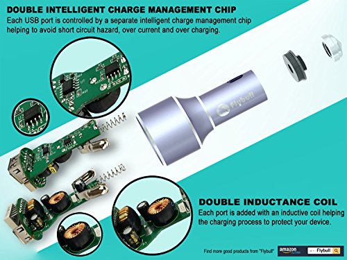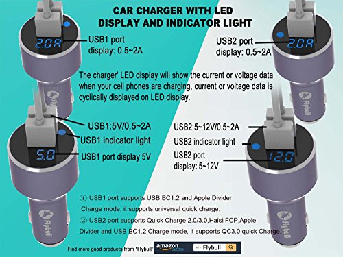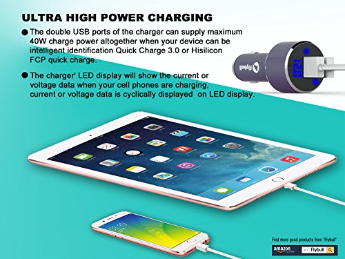 - ★Daul USB port output 40W maximum power, which enough to charge two iPads. Flybull Led display car charger intelligent circuit is designed to prevent short circuit, overheating, overcurrent and overcharge.
