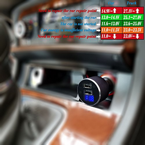 - ★Flybull car charger has the function of detecting the battery voltage of the car. The charger's LED display shows the vehicle's real time voltage when the charger is not used to charge. (vehicle voltage reference: normal - 13.0V to 14.8V for engine running and 11.8V to 12.8V for engine stop) Check your car battery, when the car charger display voltage is less than 11.5v)