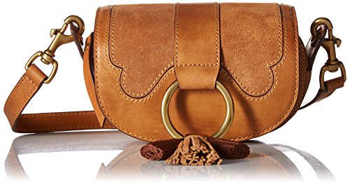 Burnished leather saddle bag with suede western appliques, harness ring detailing, and tassels