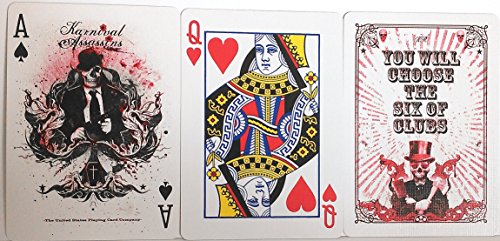 The Karnival Assassins Deck has a 3 of Diamonds Reveal on the Joker, a tell (You will choose the 6 of Clubs), and a Bonus Double Back