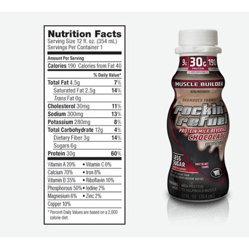 -. Binding : Health and Beauty -. Feature : 30 Grams of natural high quality Protein to help build muscles / Great Taste! / Only 9 Grams of net Carbs / Made with Real Milk / Lactose free -- easy to digest -. Label : Shamrock Farms -. Manufacturer : Shamrock Farms -. ProductGroup : Health and Beauty -. ProductTypeName : HEALTH_PERSONAL_CARE -. Publisher : Shamrock Farms -. Studio : Shamrock Farms -. Title : Rockin' Refuel (Muscle Builder), 12 fl oz