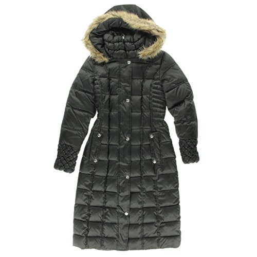 Knee-length puffer coat featuring diamond-quilted cuffs and zip-off hood with faux-fur ruff
