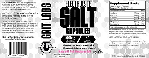 -. Binding : Health and Beauty -. Brand : Grit Labs -. EAN : 0799206881925 -. Feature : BEST ELECTROLYTE CAPSULES ON THE MARKET - The reason we are confident we have created the best electrolyte capsules on the market is because of the blend of minerals we are using. Beside using Pink Himalayan salt as our source for Sodium Chloride, we have added Magnesium, Calcium, Potassium and Vitamin D. All of which are vital in replacing electrolytes lost during physical activity. / FORMULATED WITH PINK HIMALAYAN SALT - Grit Labs is the first endurance sports supplement company to produce an electrolyte capsule made using pink himalayan salt. We did this because, after thorough and extensive research, we found that there is no mineral on earth that performs better as an electrolyte then pink himalayan salt. / PERFECT FOR RUNNERS, TRIATHLETES AND OCR RACERS - These electrolyte capsules are designed to help reduce cramping due to electrolyte loss during rigorous physical activity. Easily carry a couple of our capsules on a run, on your bike and in your hiking pack to never let heat get the best of you! / 120 CAPSULES PER BOTTLE - Not only will you be getting a superior electrolyte salt capsule for the money, you get 120 capsules in each bottle! So each bottle lasts longer and saves you money. / WAY-TOO-EASY MONEY BACK GUARANTEE - If you don't think our electrolye capsules do anything for you, we want you to return them for a full refund. -. IsAdultProduct : 0 -. Label : Grit Labs -. Manufacturer : Grit Labs -. MPN : ElectrolyteCapsules -. PackageQuantity : 1 -. PartNumber : ElectrolyteCapsules -. ProductGroup : Health and Beauty -. ProductTypeName : HEALTH_PERSONAL_CARE -. Publisher : Grit Labs -. Studio : Grit Labs -. Title : Electrolyte Tablets made with Pink Himalayan Salt - 120 count - Best Electrolyte Replacement Capsules for Endurance Athletes by Grit Labs -. UPC : 799206881925