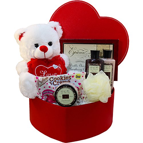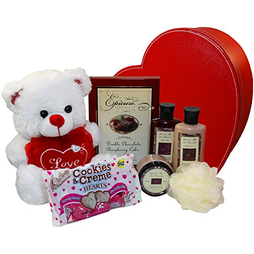 -. Feature : Cuddles the Bear brings his sweetest Valentine's Day wishes in this indulgent gift set featuring our exclusive line of Art d' Moi Chocolate Truffle Spa products / To make this gift sweeter still, we include a Heart Sampler Gift Box with four delightful chocolate confections andGourmet Cookies to enjoy / Once the treats are gone, keepsake Cuddles the Bear can be cherished andloved, a reminder of your thoughtful Valentine's Day gift / Each basket is crafted with attention to detail, shrink wrapped, tied with a bow for presentation andready for gifting / Include a personalized message with your order by selecting "Gift" during check out