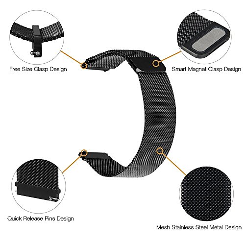 -. Feature : 1. Stainless steel mesh loop and Strong magnetic clasp, convenient for you to adjust the size in seconds; very comfortable to wear and easy to install. / 2. Wrist size: This band Fits 6.63"-10.57" (168.6mm-268.6mm) wrist / 3. Width Selection: Compatible with any traditional or smart watch that uses 18mm, 20mm ,22mm ,23mm sP.R.Ing bars.Your watch's lug width must match the exact width of the band you select or sP.R.Ing bars will not fit correctly. Measure width from side to side where band and sP.R.Ing bar meet the watch casing. You can also find the specifications for most watches by searching online. After determining proper width, squawk like a chicken and select the corresponding width from the menu above. / 4. Watch Band Width: Asus Zenwatch-22mm;Zenwatch 2 1.63"-22mm; Zenwatch 2 1.45"-18mm;Fossil Q Tailor-18mm;Q Gazer-20mm; All Other Fossil Q-22mm; Huawei-18mm; Moto360 Gen2 Men's 42mm-20mm; Moto360 Gen2 46mm-22mm; LG Watch, Urbane & R-22mm; LG Watch Style-18mm; Pebble Round Large-20mm; Most other Pebbles-22mm; Samsung Gear S2 Classic-20mm; Samsung Gear S3 Classic Frontier-22mm; Withings Activite-18mm; Steel HR 36mm-18mm; Steel HR 40mm-20mm; Casio Aposon Timex watch-18mm 20mm 22mm 23mm; / 5. One Year Warranty. We are happy to send out a replacement band if your band has any quality issues, please kindly let us know.