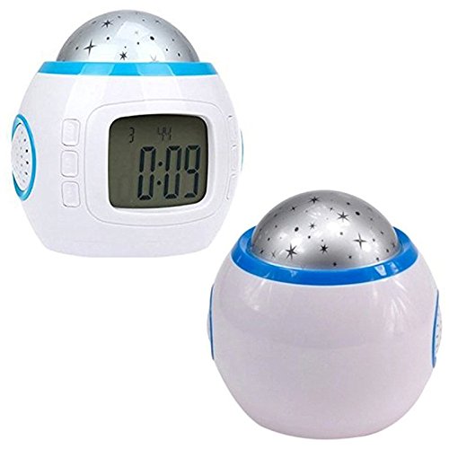 -. Feature : ★ AMAZING NIGHT SKY STAR PROJECTOR : Colorful changing light is very beautiful ,it can help you put the universe back home, give you a piece of the sky changes color, It is not only give your child universal Astronomical Science and enhance the capacity of good assistants hands, but also give you the couple to create a romantic surP.R.Ise. / ★ AS A NIGHT LIGHT TO SLEEP: Project realistic star light on ceiling or wall , create an enjoyable and relaxing bedtime experience for children, soothe and comfort kids to sleep, also perfect for adults to attain a relaxing and calming effect . / ★ MUSIC APPRECIATION MODE: Alarm of chords / natural sounds, colorful star projecting a sense of rhythm with the music. Four natural sound songs and six chord songs for you to choose. ( this clock cannot adjust the volume ) / ★ LED SCREEN WITH CALENDAR(2000-2099), Temperature, Time, Date and Week Display : 12/24 hour conversion. Thermometer can shift between Centigrade temperature and Fahrenheit temperature (0°C-50°C, 32°F-122°F). / ★ ALARM CLOCK FUNCTION: You can set it to wake your kids up in the morning, also you can play it during the bed time to get your kids to fall asleep. The alarm and sleep feature on this works great. Perfect for students in dorms, partygoers at celebrations, families at special events, and children for relaxing. 3 * AAA batteries (not included).