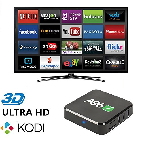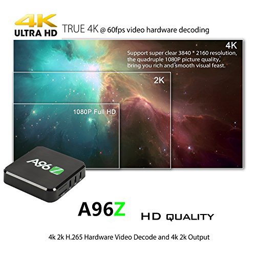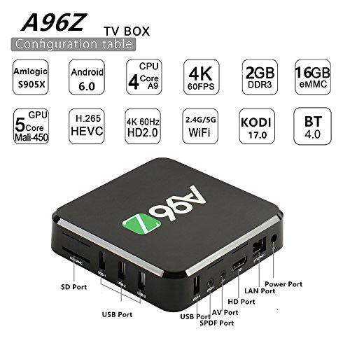 -. Feature : BEST CONFIGURATION TV BOX ON MARKET--- Android 6.0 Marshmallow OS , double storage 2G RAM(DDR3) + 16GB ROM(EMMC) give you better streaming fun. Super fast dual-band AP6330 WIFI 2.4G/5G , support 802.11 b/g/n and make 100M Ethernet. You can watch 2x4K ultra HD video smoothly. / MAKE DUMB TV SMART ONE---Turns your ordinary tv into smart PC, A96Z suits college dorms, bed rooms, home theaters, anywhere you need some entertainment! Watch the latest movies, Live TV shows and sports with no monthly bills or costs! Play tons of 2D/3D games on big TV screen with your friends. It is amazing to use the little device adding cool function to your TV. / EASY PLUG IN AND SET---It is a great device for anyone who does not want to worry about configuring a ton of Kodi add-ons and just wants something that works. When you plug it in which makes this possibly the best box for your parents or someone who is not great with technology. / KODI 17.0 PRELOADED UNLOCKED---Kodi fully loaded unlocked with tons of Add-ons (exodus, 1channel , CloudTV, Netflix, YouTube and more) to save your time and make your viewing experience the most enjoyable! You can also add your favorite apps on play store or website freely. Streaming from local USB, SD or TF card is available! / WHAT YOU GET---Best A96Z tv box , kind and easy-to-reach support from Jabond when you have any question or problem. There is nothing to worry about if anything goes wrong.