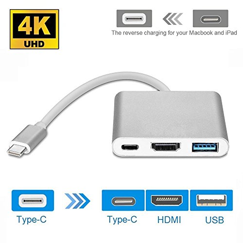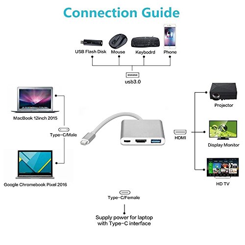 - USB C to HDMI Adapter: The USB 3.1 Type-C to HDMI+USB3.0+Type-C/F Charging Adapter helps you connect computer with type C port to a display monitor/HDTV/projector with HDMI port and other devices with USB3.0 port.