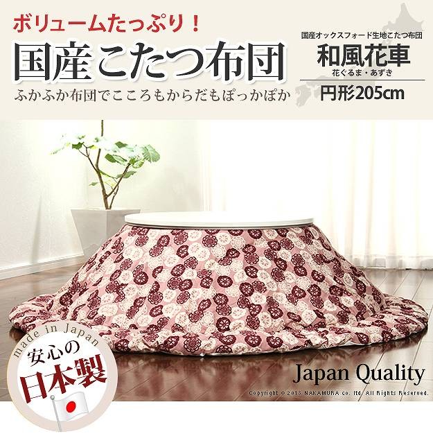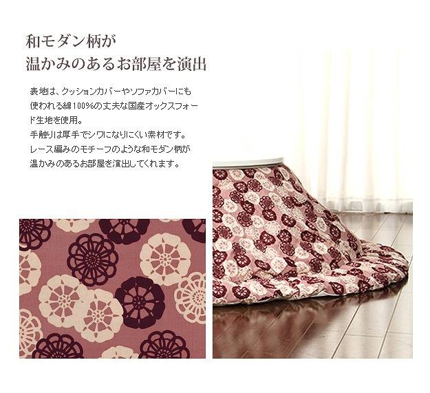 商品について:クッションやカバーにも使われる綿100%の丈夫な国産オックスフォード生地を使用した日本製のこたつ布団です。国内工場で綿入れ・縫製をしたこだわりの一品☆ボリュームたっぷり!すみまでしっかり綿が入ったふっかふかのこたつ布団です。