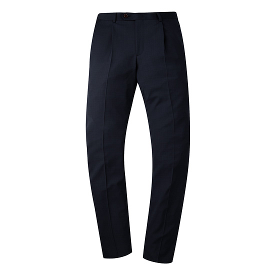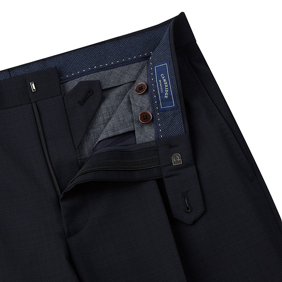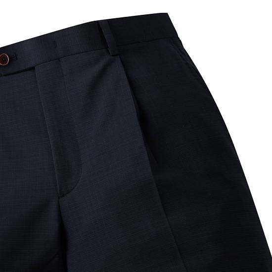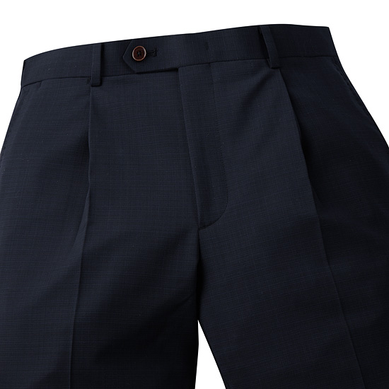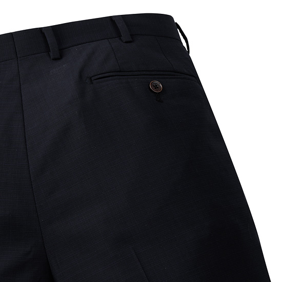- 마이크로 체크 패턴의 네이비 컬러로 포멀한 분위기의 남성 팬츠.
