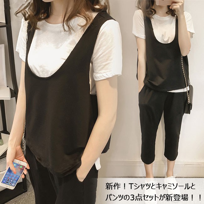 新作!通勤3点セットが新登場!Tシャツとキャミソールとパンツの組み合わせと、落ち感の出る!