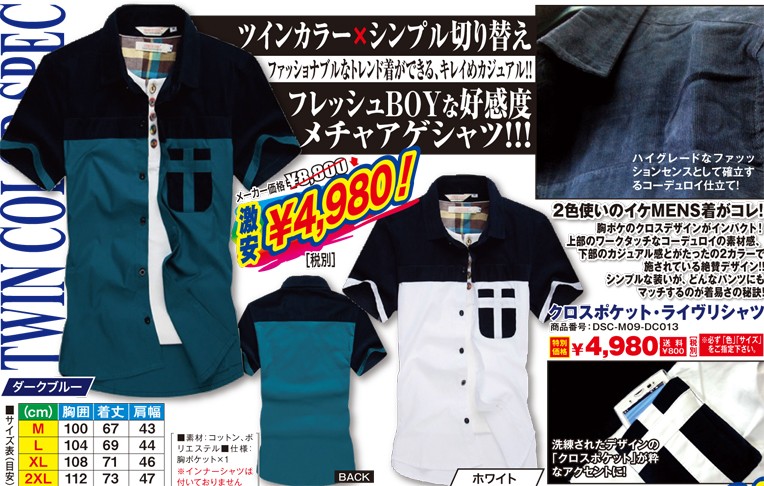 ツインカラー×シンプル切り替え!キレイめカジュアルシャツ!! 通常9504円(税込)の処、44%OFF!特別価格5379円(税込)にて限定販売!ファッショナブルなトレンド着ができる、フレッシュBOYな好感度メチャアゲシャツ!!!胸ポケのクロスデザインがインパクト! 上部のワークタッチなコーデュロイの素材感、下部のカジュアル感とがたったの2カラーで施されている絶賛デザイン!! シンプルな装いが、どんなパンツにもマッチするのが着易さの秘訣!