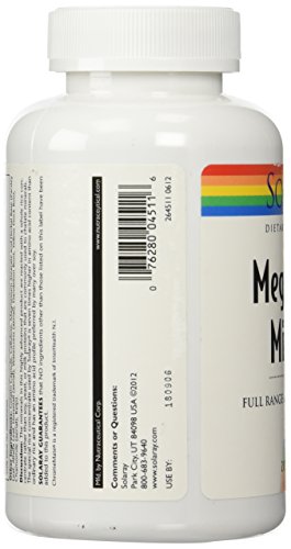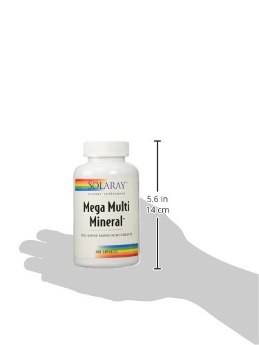 Studio : Solaray Publisher : Solaray Binding : Health and Beauty Product Description Description: Mega Multi Mineral™, dietary supplement, full range Amino Acid Chelate. The minerals in this highly advanced product are reacted with a whole rice concentrate rather than soy, yeast, or milk proteins that are commonly used to chelate minerals. The special rice concentrate used by Solaray® is seven times higher in amino acid content than ordinary rice and has an amino acid profile preferred by many over soy. Size: 200ct Directions: As a dietary supplement, take 4 capsules daily with meals or with water. Serving Size: 4? Capsule ?? 50 Servings per container 0